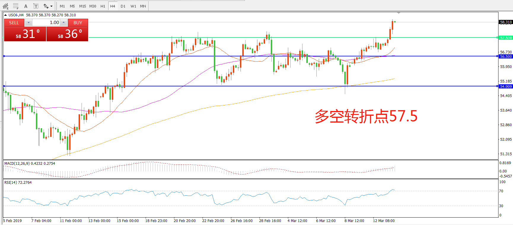 4小时图看,油价触及200周期均线附近连续反弹,昨日强势突破前期阻力57.5一线阻力,短期走势偏强,均线系统呈多头排列,MACD红柱增加,RSI指标向上,日内震荡上行概率较大