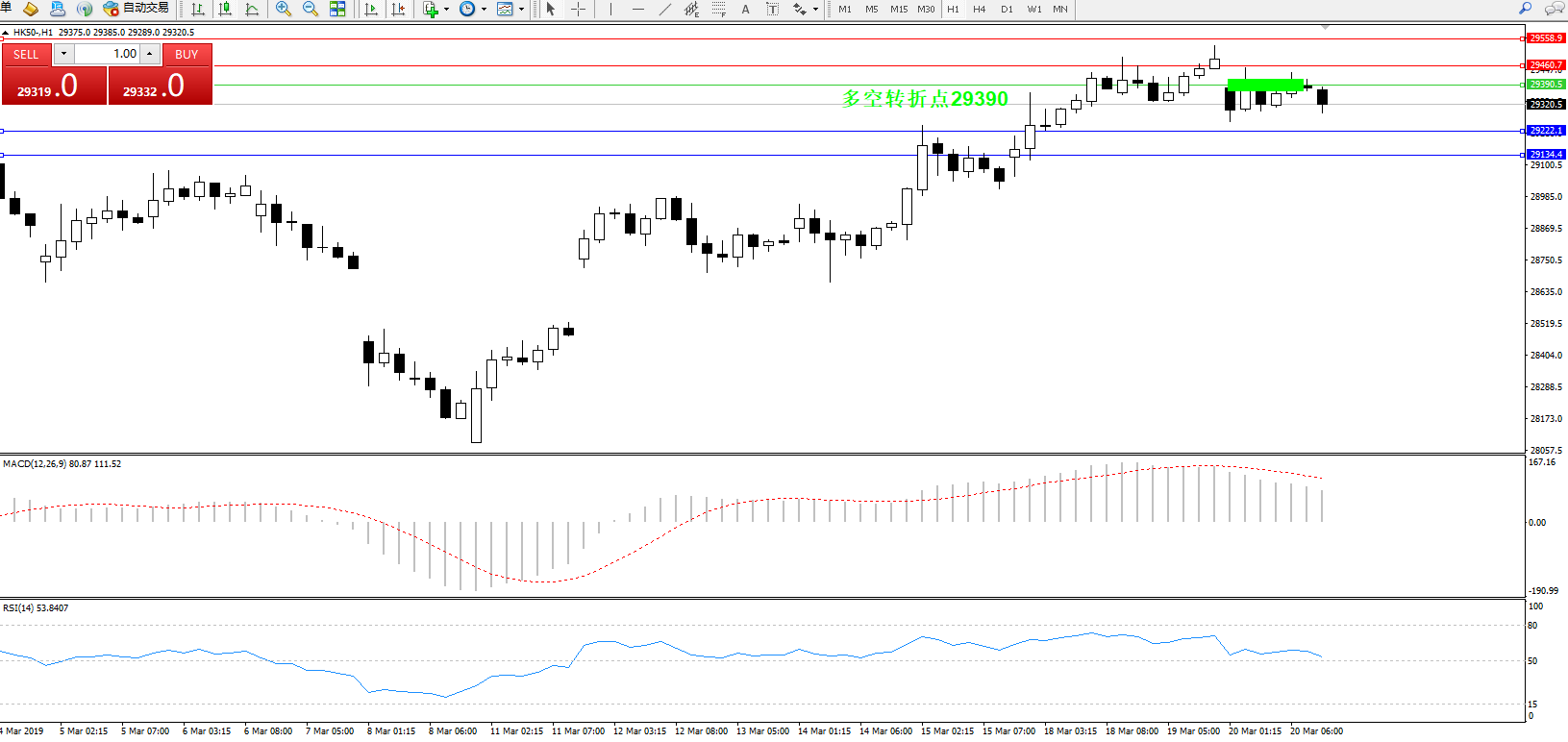 恒指HK50 ——1小时K线图显示: