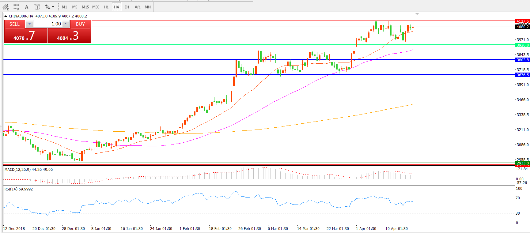 4小时图看,中华指数阳两度触碰上方阻力后出现回落,整体来看上方阻力较强,重点关注4127一线得失。均线系统呈多头排列,MACD红柱减少,RSI指标拐头,日内延续震荡概率较大。