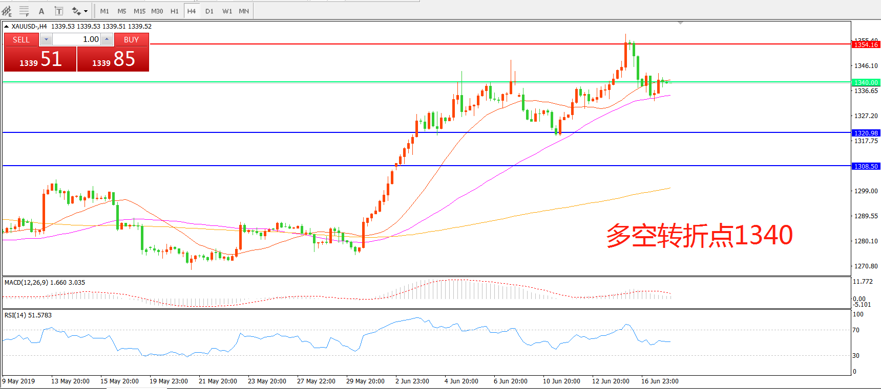 因G20峰会及美联储议息会议在即,金价出现获利回吐行情,昨日一度下跌至1330美元附近,随后回升,最终收报1339.18美元/盎司。路透社日内撰文表示,即使美联储近期再次遭遇美国总统特朗普对利率的斥评,也预期在本周维持按兵不动,但可能为今年晚些时候的降息做出铺垫。