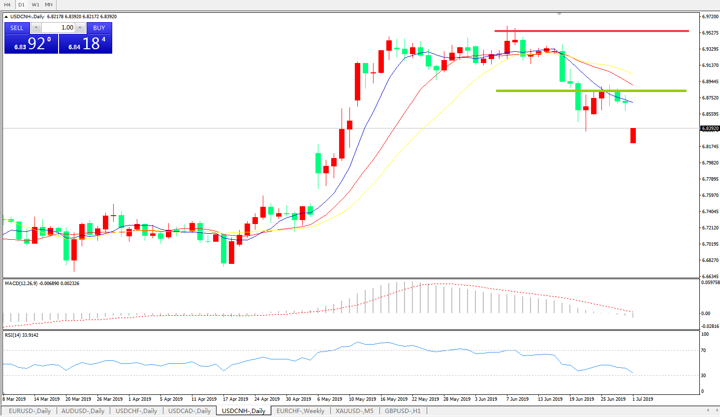 技术面简析:日线图呈有序空头排列,MACD下穿0轴且动能柱持续放量,RSI逐步走低,G20贸易争端缓解预期落实,预计汇价大概率将进一步走低。