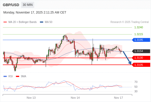 在 1.3195 之下,看跌,目标价位为 1.3130 ,然后为 1.3105 。