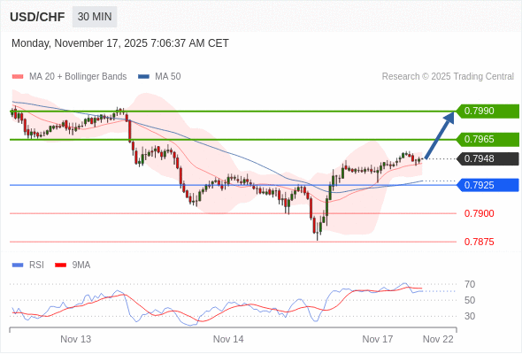 在 0.7925 之上,看涨,目标价位为 0.7965 ,然后为 0.7990 。