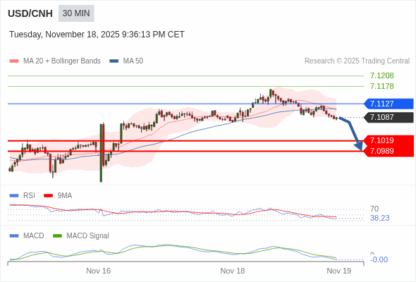 美元/人民币 当日内 : 看跌,在 7.1127 之下。