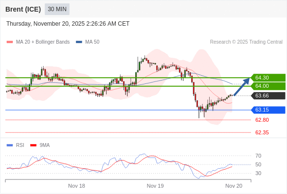 在 63.15 之上,看涨,目标价位为 64.00 ,然后为 64.30 。