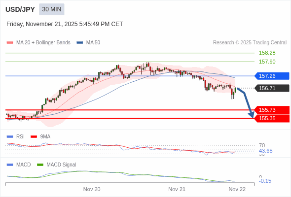 美元/日元 当日内 : 看跌,在 157.26 之下。