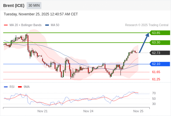 在 62.10 之上,看涨,目标价位为 63.30 ,然后为 63.85 。