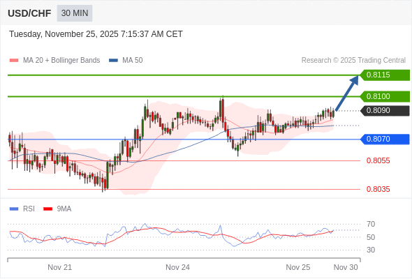 在 0.8070 之上,看涨,目标价位为 0.8100 ,然后为 0.8115 。