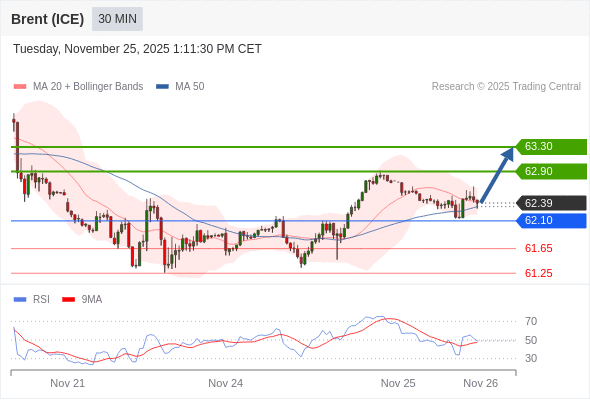 在 62.10 之上,看涨,目标价位为 62.90 ,然后为 63.30 。