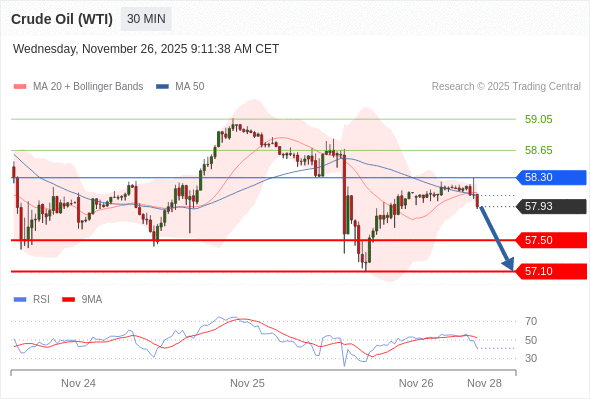 在 58.30 之下,看跌,目标价位为 57.50 ,然后为 57.10 。