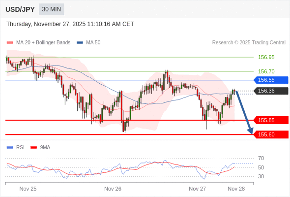 在 156.55 之下,看跌,目标价位为 155.85 ,然后为 155.60 。