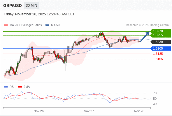 在 1.3205 之上,看涨,目标价位为 1.3255 ,然后为 1.3270 。