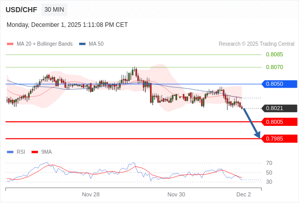 在 0.8050 之下,看跌,目标价位为 0.8005 ,然后为 0.7985 。