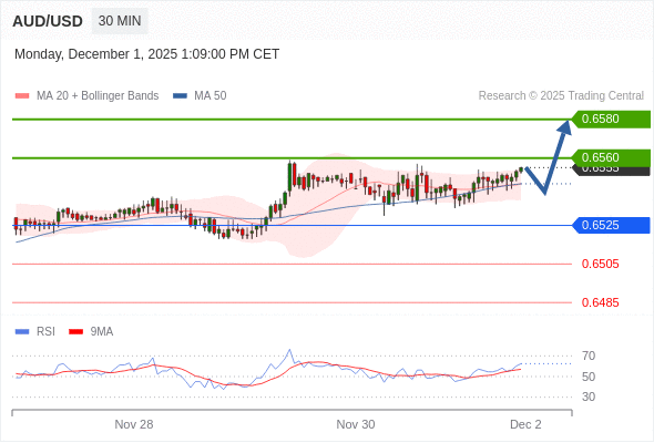在 0.6525 之上,看涨,目标价位为 0.6560 ,然后为 0.6580 。