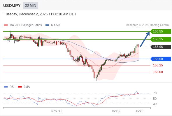 在 155.20 之上,看涨,目标价位为 156.25 ,然后为 156.55 。