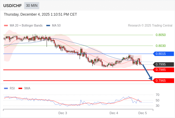 在 0.8015 之下,看跌,目标价位为 0.7985 ,然后为 0.7965 。