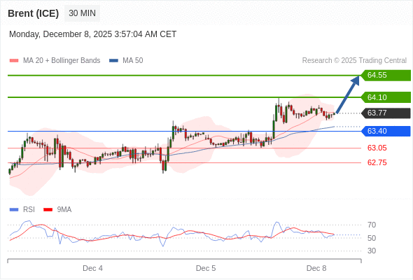 在 63.40 之上,看涨,目标价位为 64.10 ,然后为 64.55 。