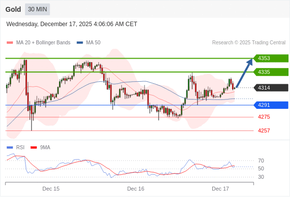 在 4291 之上,看涨,目标价位为 4335 ,然后为 4353 。