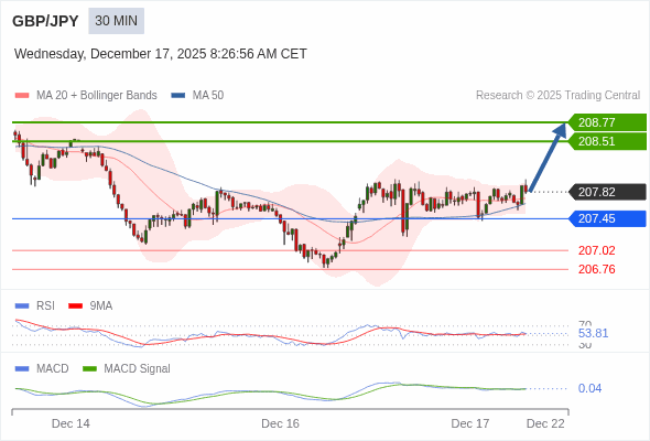 英镑/日元 当日内 : 看涨,当 207.45 为支撑位。
