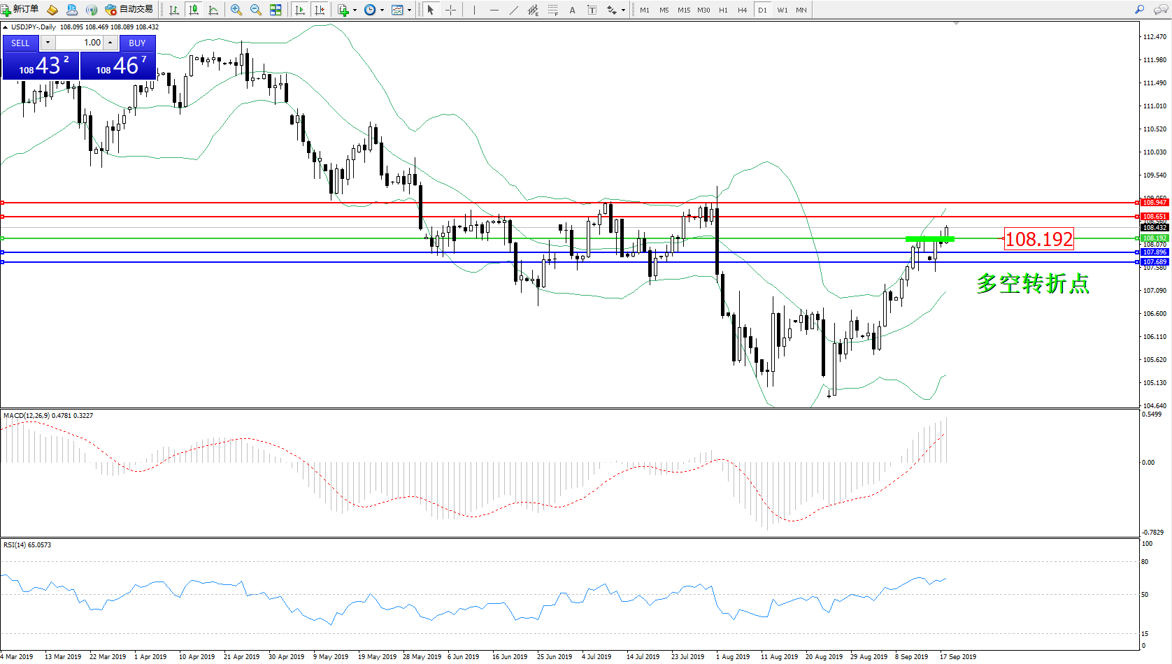 美联储最新点阵图显示2019年不会继续降息,这一情况正在对美元产生提振作用,因为市场在重新评估政策制定者接下来的鸽派程度。可以看到,预估中值维持了2020年利率不变,2021年与2022年将迎来上调,等于是美联储已经温和暗示宽松政策可能已经就此结束,美日上涨0.30%,接近盘中高点108.48,为81日以来最高,并保持在100日移动均线108.02的上方。