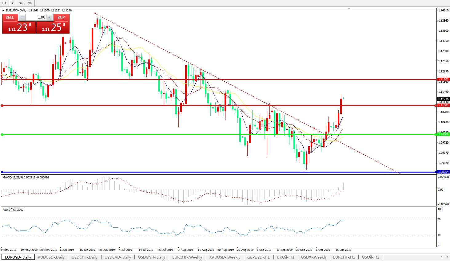 欧元兑美元在周四日内走高,升至1.1140这一近两个月来的新高,主要是受到了英国与欧盟顺利达成脱欧协议在即这一消息的拉动。而近一周以来,带动欧元汇价走势的主要动能,也来自于英镑汇价的连带强势; 上周以来,有关英国脱欧方面的整体向好的消息面状况推动者英镑兑美元在剧烈震荡中逐步走升,而如果能够及早化解脱欧问题的不确定性,也能令欧元区经济免受“硬脱欧”风险事件的打击。因此,欧元也跟随英镑一并走强,只是幅度不及后者; 而在欧元区自身缺乏消息事件引导的状况下,欧元最近一周也就成了英镑的“影子货币”,在日内英国脱欧协议在本国议会表决的前景再度堪忧导致英镑汇价回落后,欧元兑美元同样脱离高位,只是回落幅度同样不及英镑。考虑到此后直至月底,英国脱欧问题仍有众多变数,欧元走势跟随英镑的趋势仍将延续下去