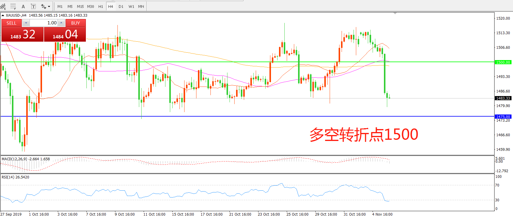 周二(11月5日),美国供应商管理协会公布的数据显示,美国10月ISM非制造业指数54.7,好于预期,美元短线拉升逾20点,现货金价大幅下挫20美金,跌破1490美元关口,收报1483.32美元/盎司。中美贸易局势向好支撑了市场的风险偏好情绪,全球股市上涨打压避险,但全球央行宽松,中东局势等因素仍然是金价的支撑。