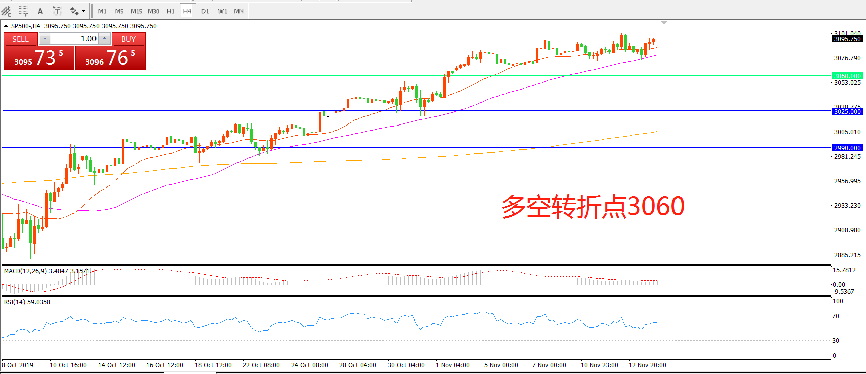 4小时图看,标普500维持上行趋势,整体较为强势,均线系统有走平迹象,MACD红柱减少,RSI指标向上,短期操作依然以多头思路为主。