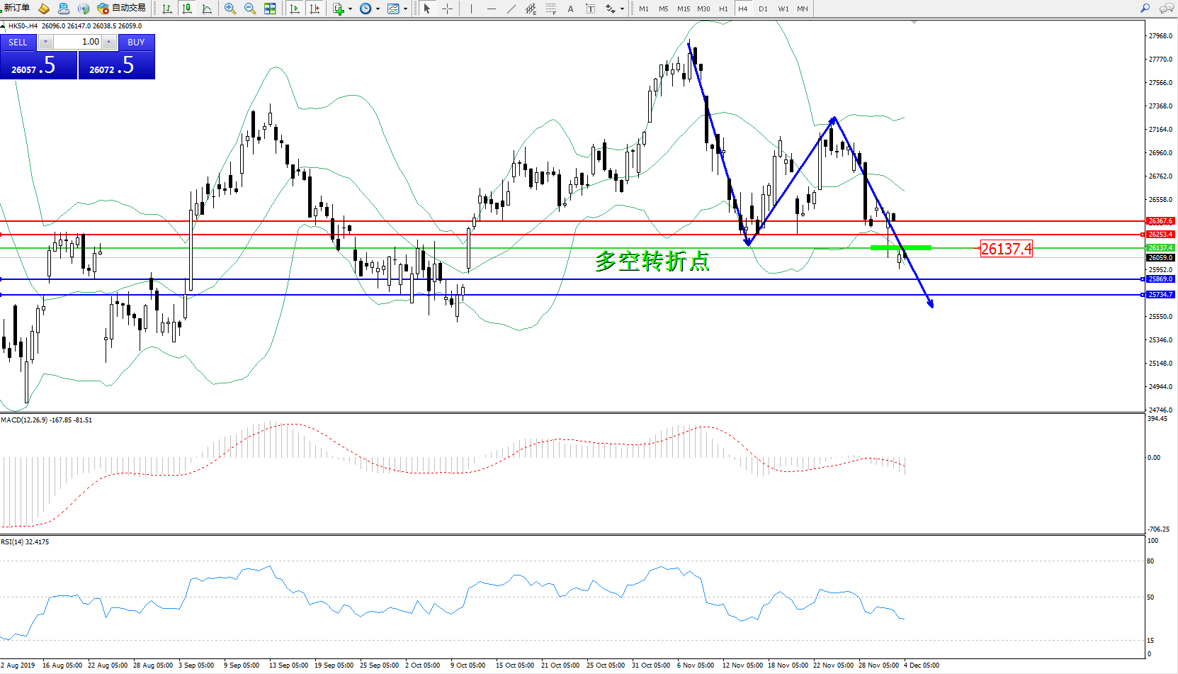 恒指HK50 ——4小时K线图显示: