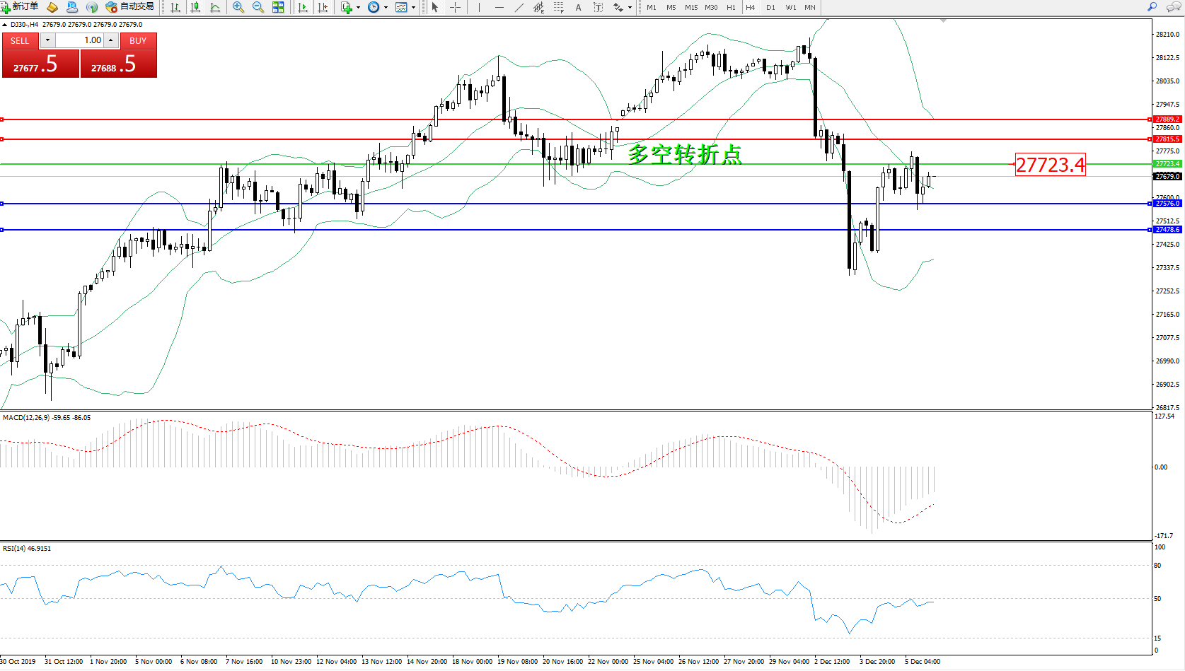 道琼斯指数DJ30—— 4小时K线图显示: