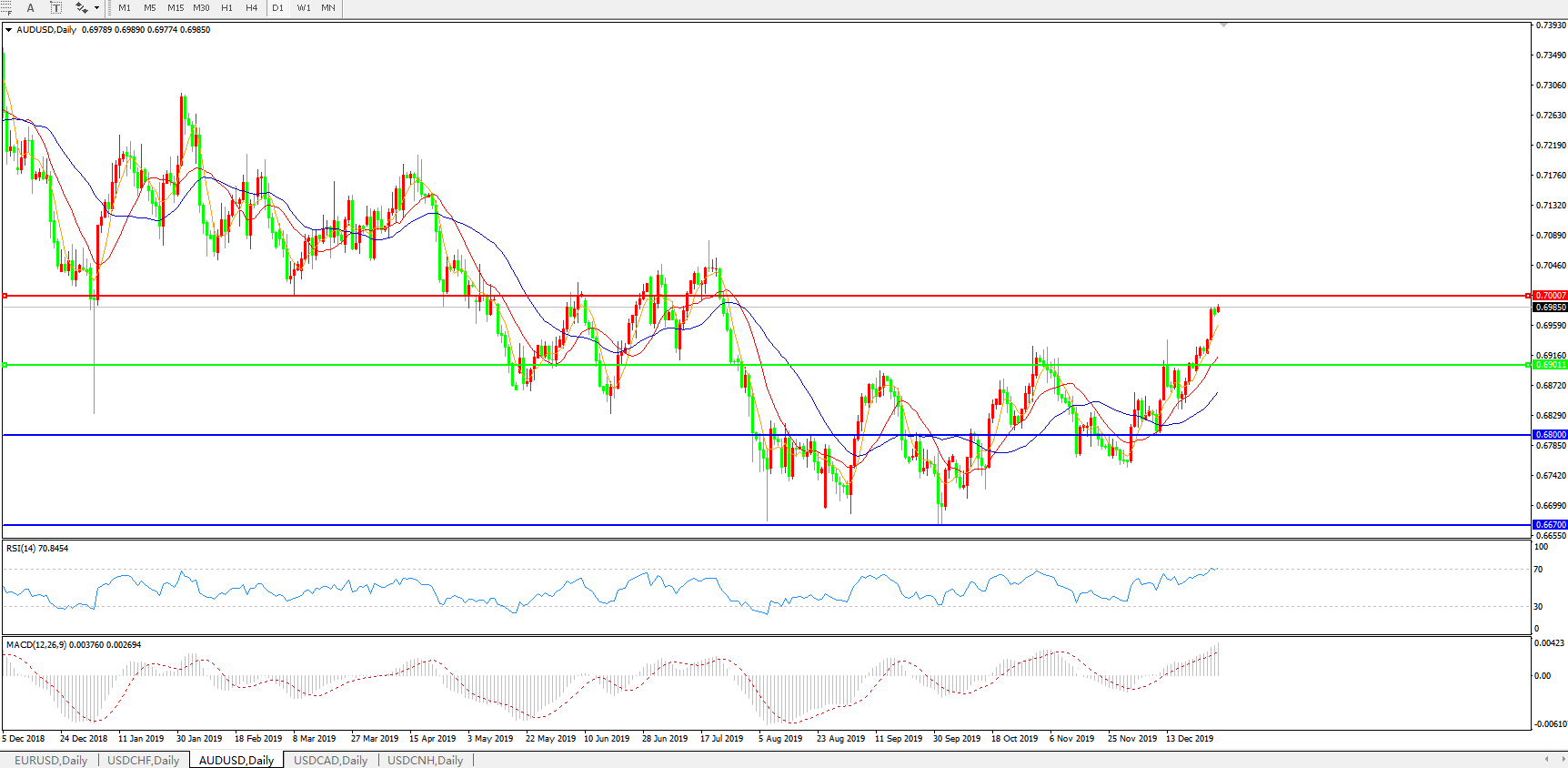 澳元兑美元在周五节后澳洲市场首个交易日延续此前强势,升触0.6955这一五个月高位,反转形态进一步巩固。澳元继续走强的原因在节后市场重新开盘之际,投资者调整仓位重新抛售了美元,这令非美货币普遍走强;并且,展望2020年前景,投资者基于近期的最新消息面背景也继续押注全球贸易前景有望进一步回暖,全球经济增速也有望见底走出低估。这对贸易敏感的货币澳元这是持续利多。因此,商品系货币近期都延伸着格外强劲的表现;而此前在节前,澳元兑美元已经有效突破了200日均线阻力位,为之后的进一步反弹打开了通道,这意味着有效阻力水平已经上移到0.70心理关口,若突破该点位,则澳元中期反转形态将进一步得到确认