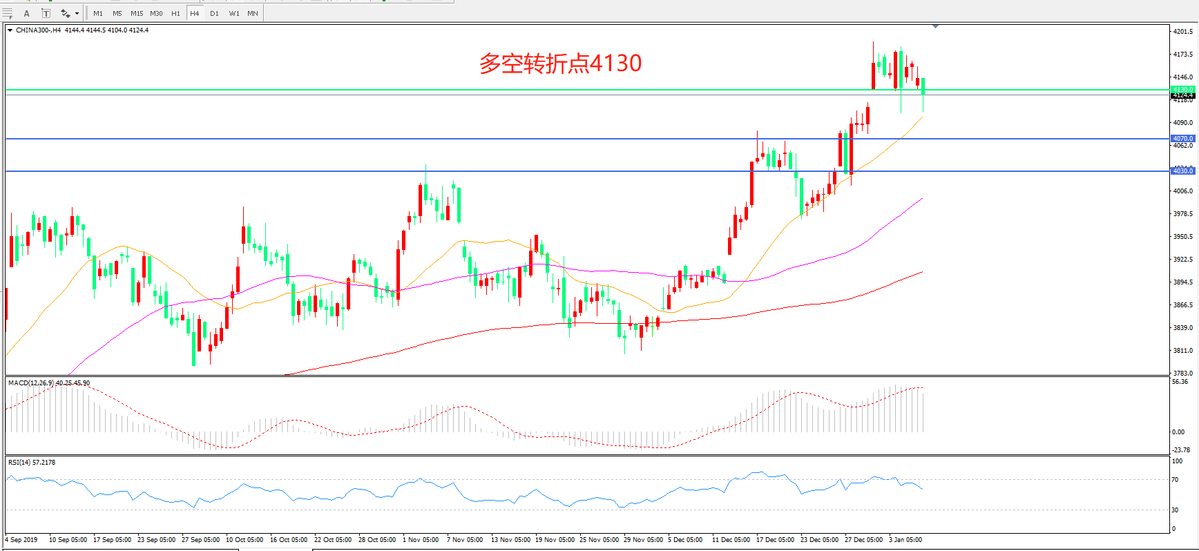 4小时图看,沪深300延续高位震荡,4130一线被破,短期走势有回调迹象,但均线系统呈多头排列,MACD红柱缩短,RSI指标向下,日内延续震荡概率较大。