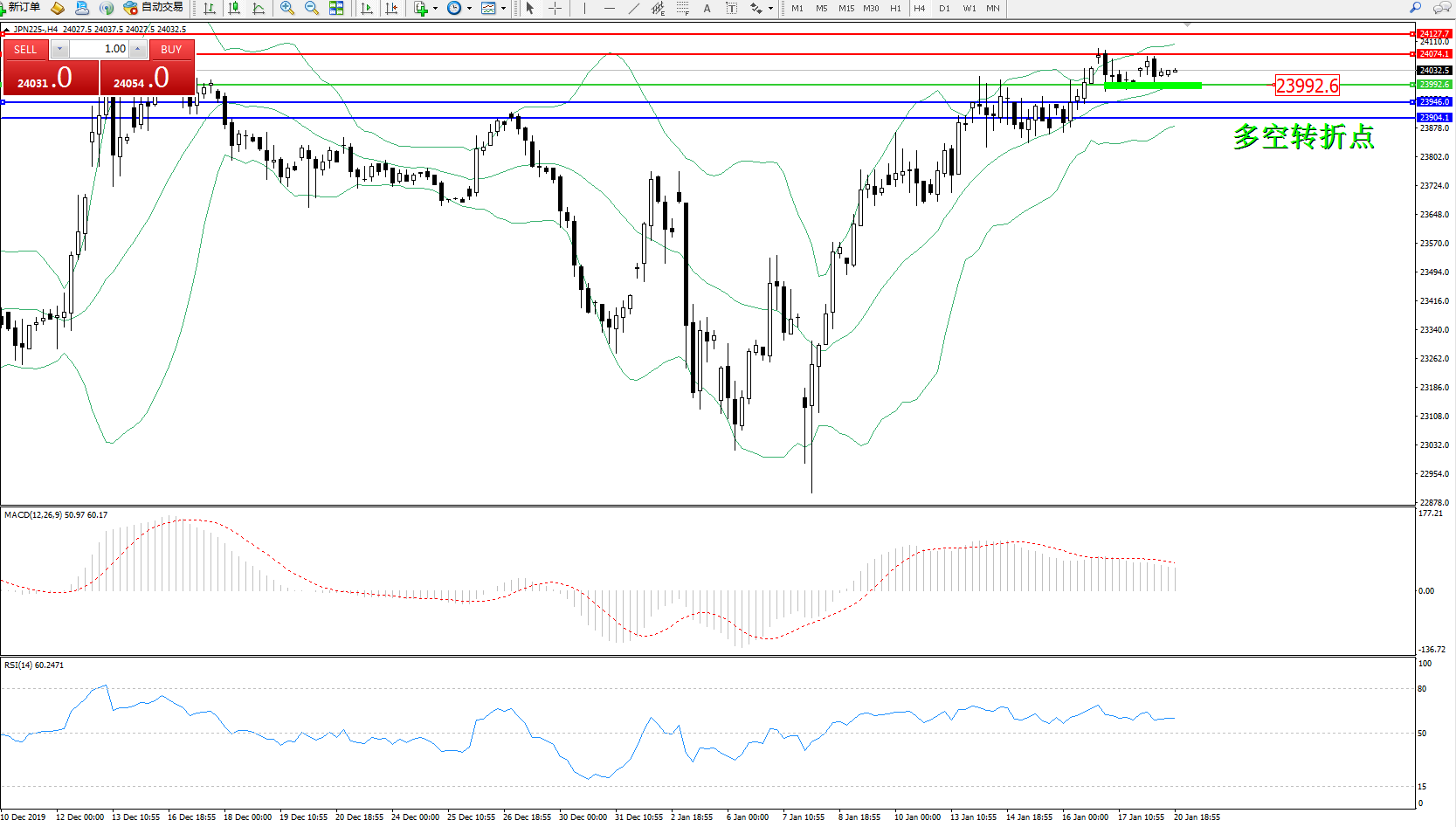 日经225指数1月20日(周一)收盘上涨43.24点,涨幅0.18%,报24084.50点。日本央行本周或选择继续维稳;调查显示,受访的42位经济学家都预测,日本央行本周将维持利率,资产购买及其政策指导不变;人们将注意力集中在央行的季度预测以及对经济复苏信心增强的任何迹象上,这也使得未来采取宽松政策的可能性降低。受到首相安倍晋三上个月公布的1200亿美元刺激方案的提振,日本央行预计将在一年来首次提高经济增长预测。即使增长前景改善,人们依然普遍预计行长黑田东彦会暗示他仍然倾向于进一步放松政策。日本央行不想与美联储或欧洲央行的立场出现太大偏差,后两者均表示,风险依然很高,它们正在谨慎评估数据。要判断可能推动经济形势在2019年最后三个月发生逆转的10月份调高消费税的影响,对日本央行而言也为时过早。秋季将购物者留在家中并导致生产中断的极端天气,也使得日本央行很难通过最新统计数据来评估真实的经济状况。