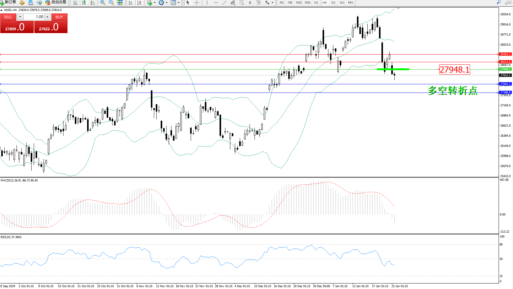 香港恒生指数1月23日(周四)收盘下跌431.92点,跌幅1.52%,报27909.12点;恒指跌1.52%失守28000点,港股三大指数跟随A股,地产、濠赌股领跌,在武汉肺炎疫情阴霾的笼罩下纷纷收跌。香港卫生防护中心总监黄嘉庆最新表示,香港初步确诊第2例新型肺炎。澳门确诊第二宗新型冠状病毒感染确诊病例,澳门旅游局宣布,取消所有农历新年庆祝活动,濠赌股全线大跌。提醒:明日港股上午继续开市,下午休市。