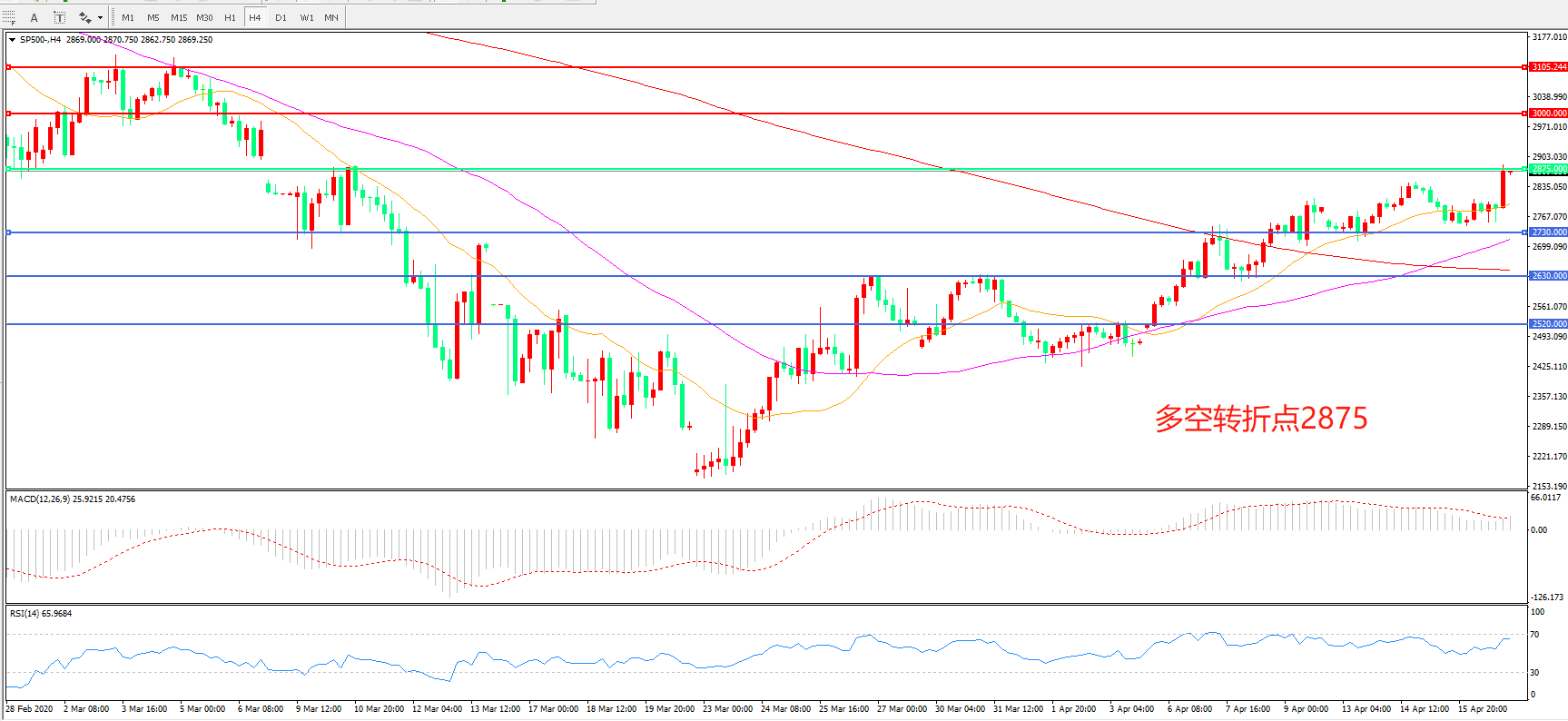 周四(4月16日),美股上演V型反转,因纽约州长宣布纽约的防疫限制措施将延长至5月15日,美股闻讯短线跳水,但美国总统特朗普制定了各州分阶段重启经济的指引,要求各州迅速提供防护装备以便重新开放,受此提振,标普500尾盘大幅上涨,收报2882.75点。