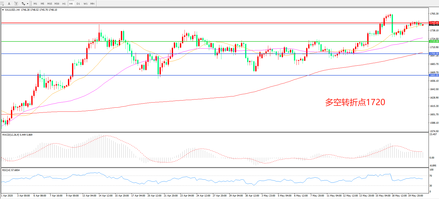 周三(5月20日),美联储公布4月会议纪要,重申维持利率在近零附近的立场,联储委员们一致同意美联储致力于使用所有工具支撑经济。宽松的货币政策预期推升金价进一步反弹,现货黄金震荡上行,收报1748.43美元/盎司。