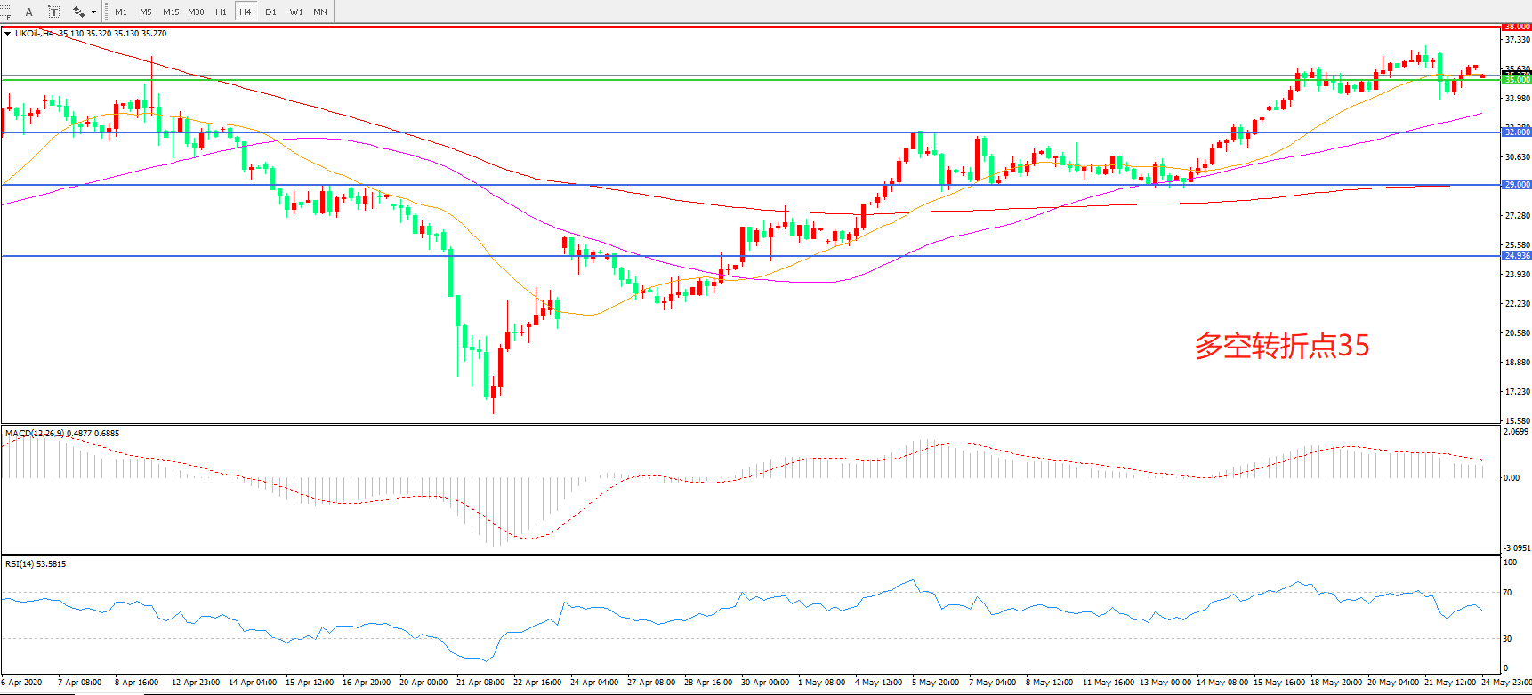 4小时图看,油价延续高位震荡,围绕35美元进行短期整理,均线系统呈多头排列,MACD红柱减少,RSI指标向上,日内延续震荡概率较大。