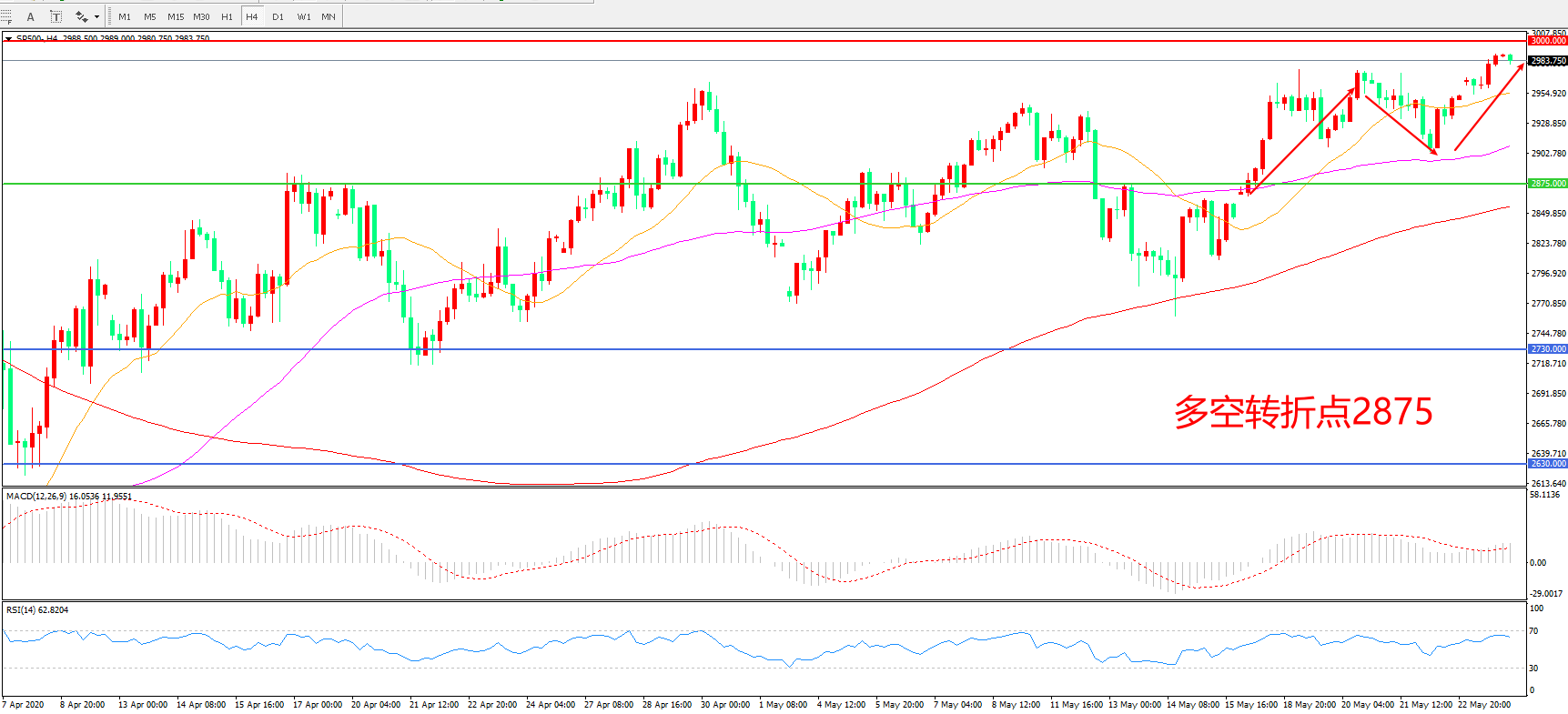 4小时图看,标普500呈现高位震荡形态, 多空博弈十分焦灼,2970成为上方阻力。55周期均线成为下方支撑,MACD红柱减少,RSI指标走平,日内延续震荡概率较大。