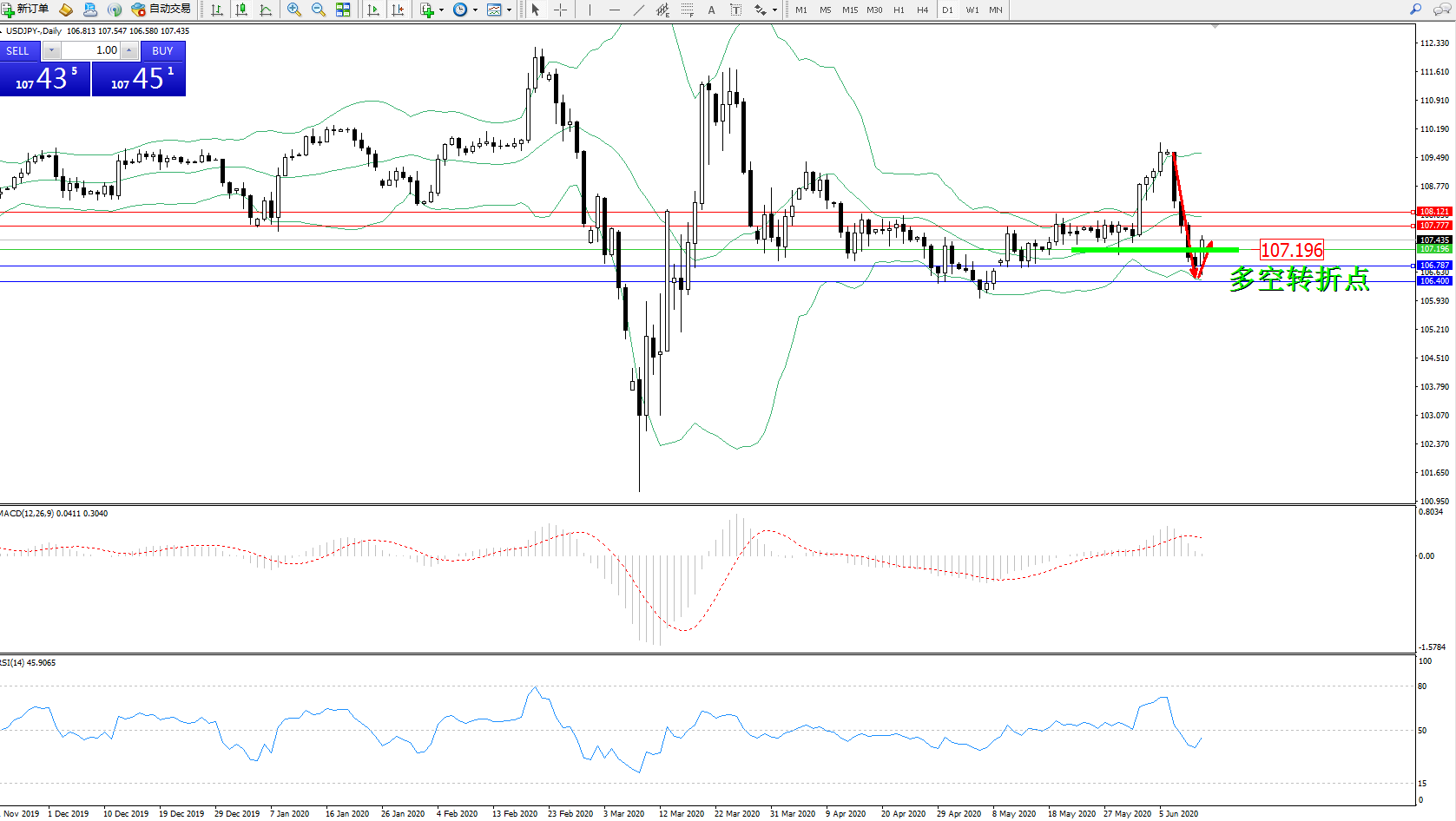 技术点评:空头动力高位急速下挫至布林带指标下轨附近后得到短期支撑,开始震荡回升反转上移,处于布林带指标中下轨区间持续震荡,下行动力得到短期喘息,布林带指标呈张口走势持续中,MACD指标处于0轴线上方多头区域快速震荡回撤至0轴线附近徘徊,RSI指标空头动力急速震荡下破50均衡线进入空头区域后震荡有反转态势;