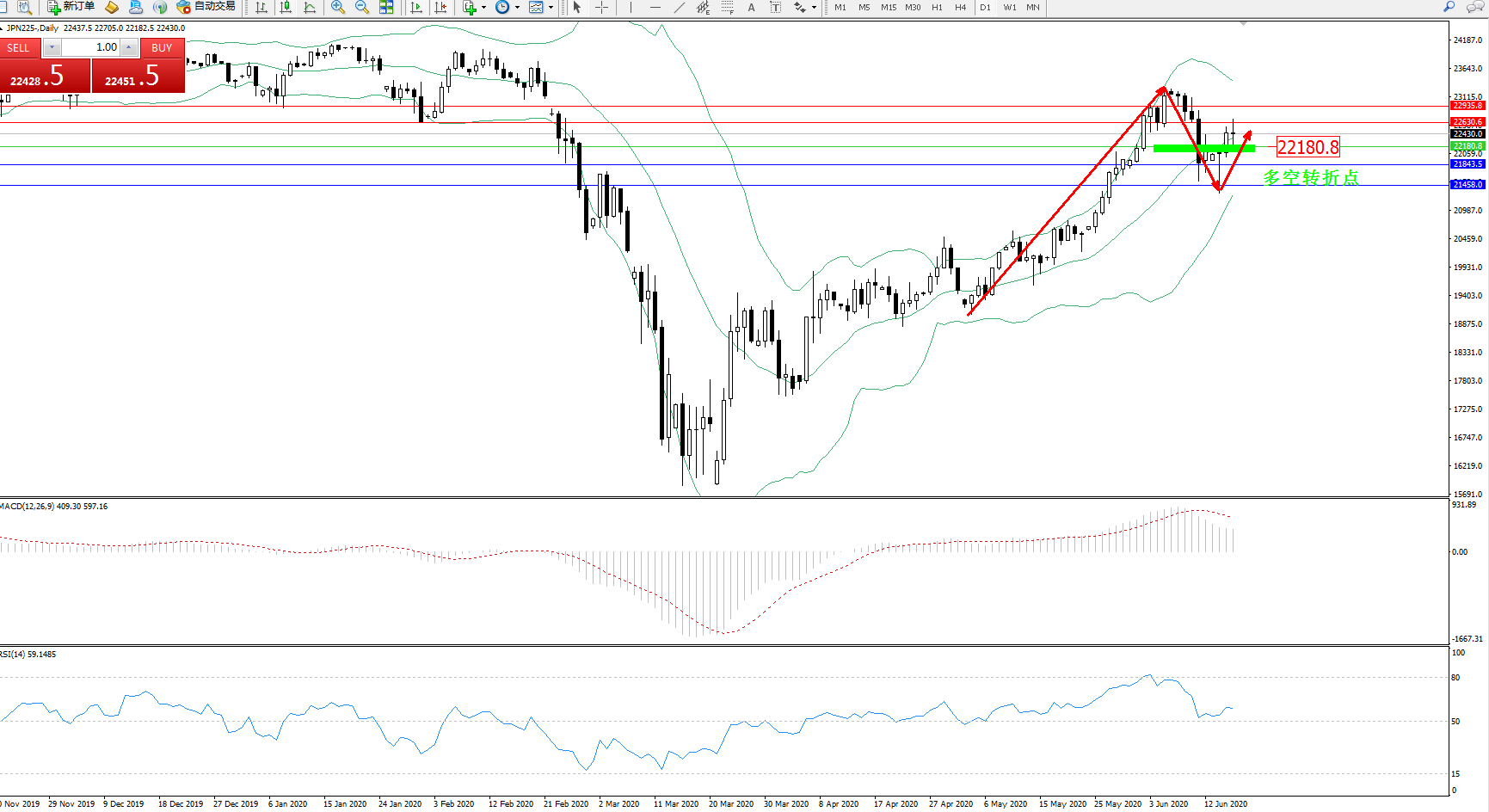 日经225指数6月17日(周三)收盘下跌129.71点,跌幅0.57%,报22452.50点。日内亚洲地区地缘紧张局势发酵,尽管美股隔夜大涨,亚洲股市纷纷承压,此外投资者对二次疫情的爆发也充满担忧情绪,日本5月出口降幅扩大,在新冠疫情导致贸易下滑之际,对美国的出口下降一半。整体出口同比下滑28.3%,为2009年以来最大降幅,汽车及零部件出口锐减。经济学家预期为下滑26.1%。日本5月与美国的贸易顺差降至纪录低位,对美出口创2009年全球金融危机以来最大降幅。整体而言,汽车出口下滑约三分之二;全球GDP前景或比预期更糟,即使隔夜美元在美国数据利好及美联储主席鲍威尔偏鹰言论下大涨,市场仍对本周后半段全球风险情绪面临的下一步不确定性感到不安。