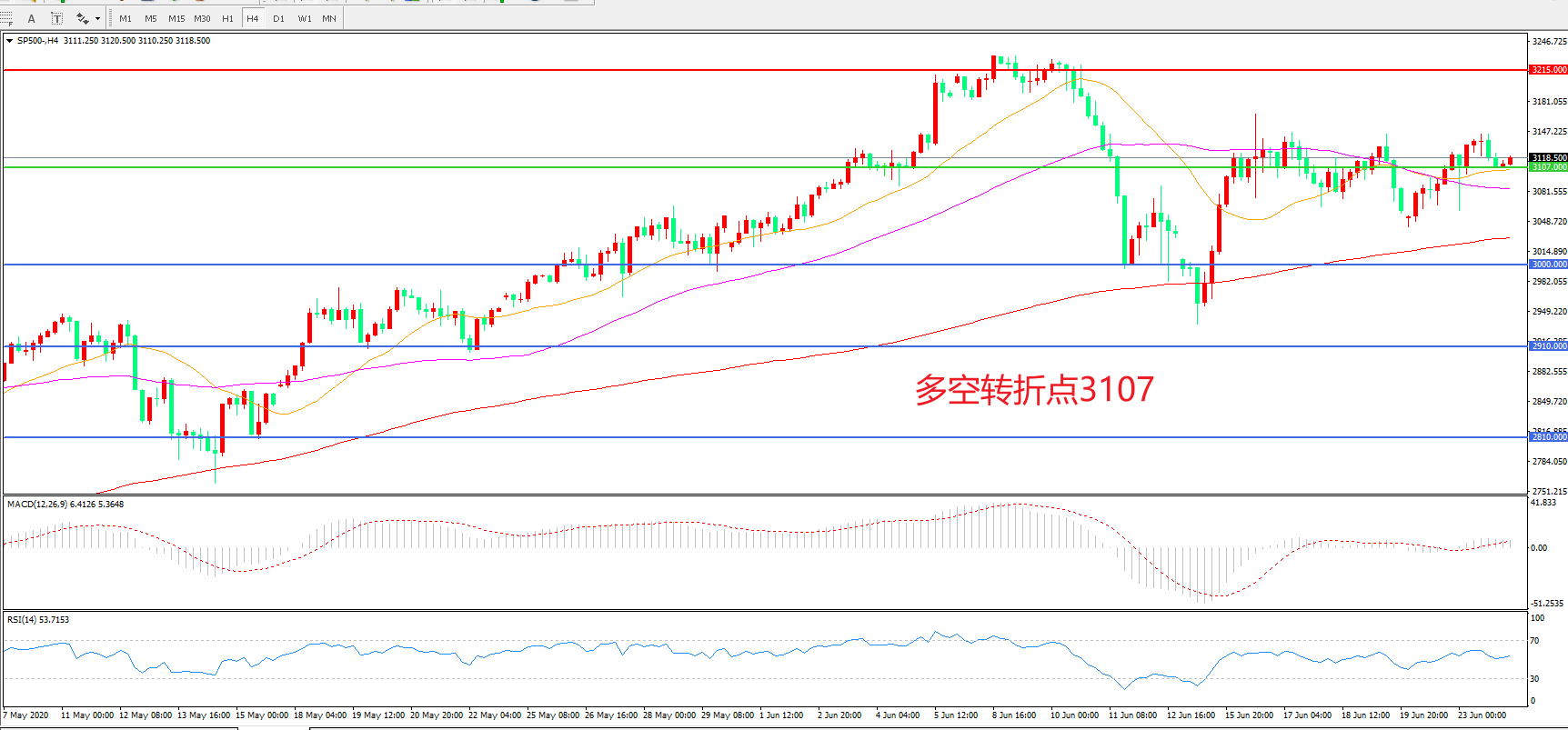 4小时图看,标普500延续宽幅震荡走势,3050成为短期支撑,3160成为上方阻力,均线系统走平, MACD红柱增加,RSI指标向上,日内延续震荡概率较大。