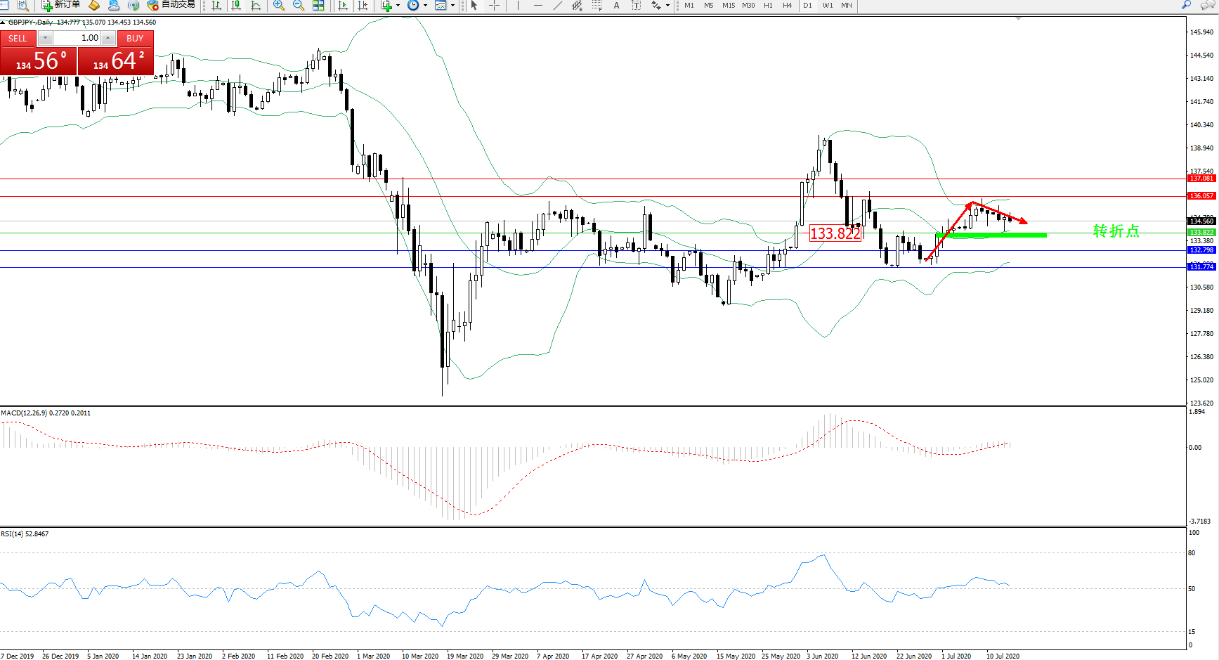 交易策略:133.822上方看涨,目标136.057、137.081