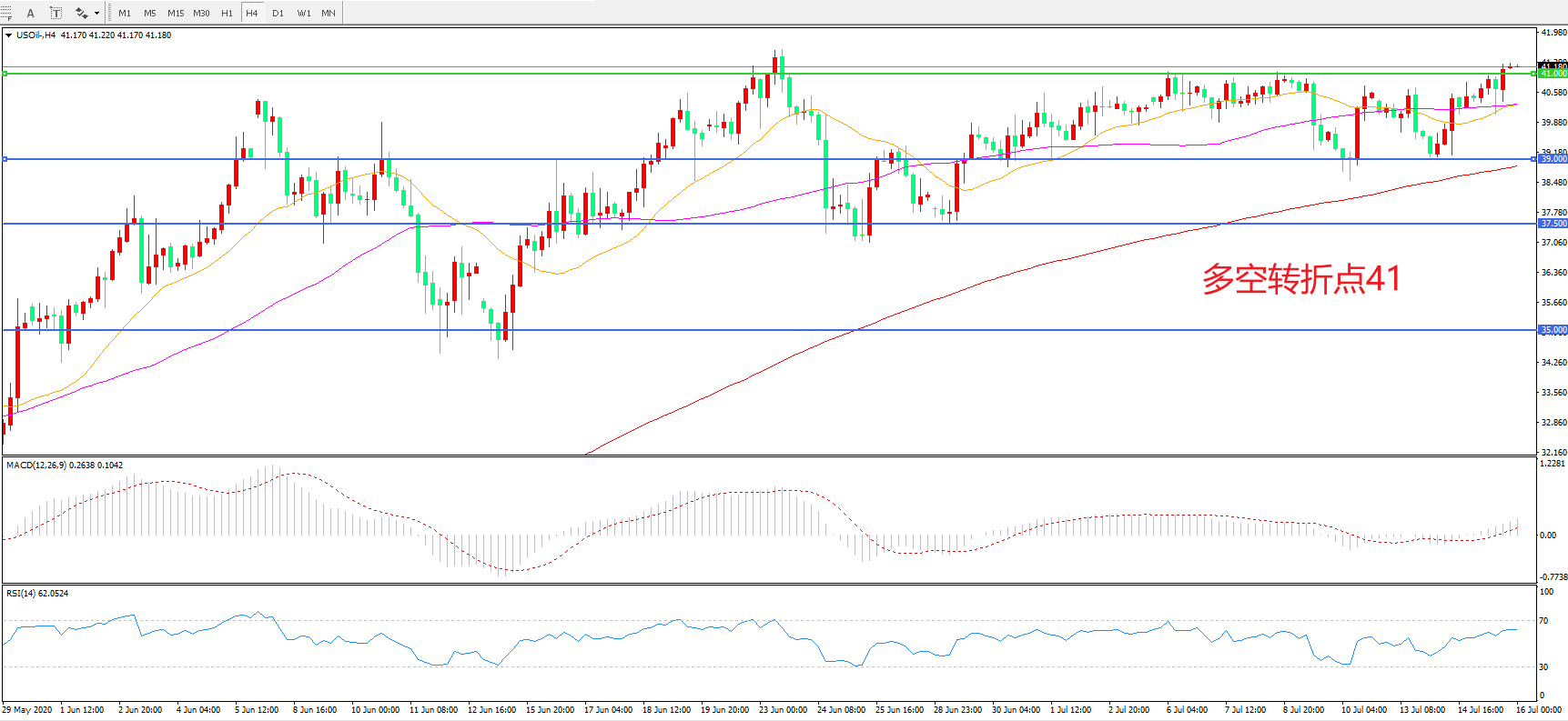 4小时图看,油价震荡反弹,短期表现偏强,41美元阻力被突破,均线系统形成金叉,MACD红柱增加,RSI指标走平,日内延续上行概率较大。