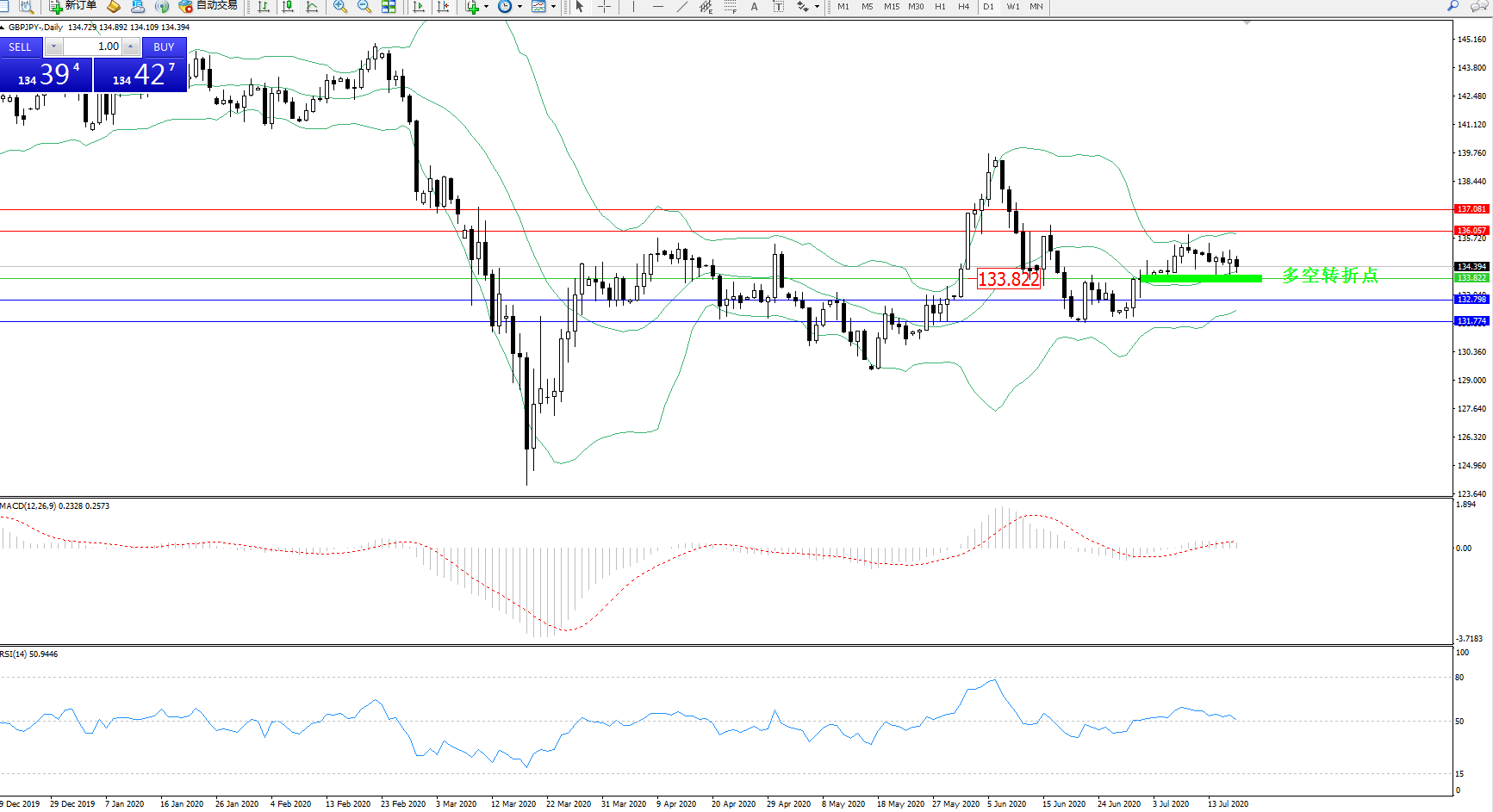 英镑兑日圆弱势震荡回撤至134.394附近,英国经济正努力从疫情衰退中复苏,无奈复苏势头乏力,这导致越来越多的华尔街经济学家预测,英国央行将在未来几个月进一步降息,以重振英国经济增长;7月16日,高盛预计,英国央行官员可能在8月份发出信号,暗示利率可能转为负值;美国银行认为随着失业率恶化加上通胀前景减弱,英国央行将把基准利率从0.1%下调至零;加拿大银行认为英国央行最早可能在11月就被迫接受借贷成本为负的局面。