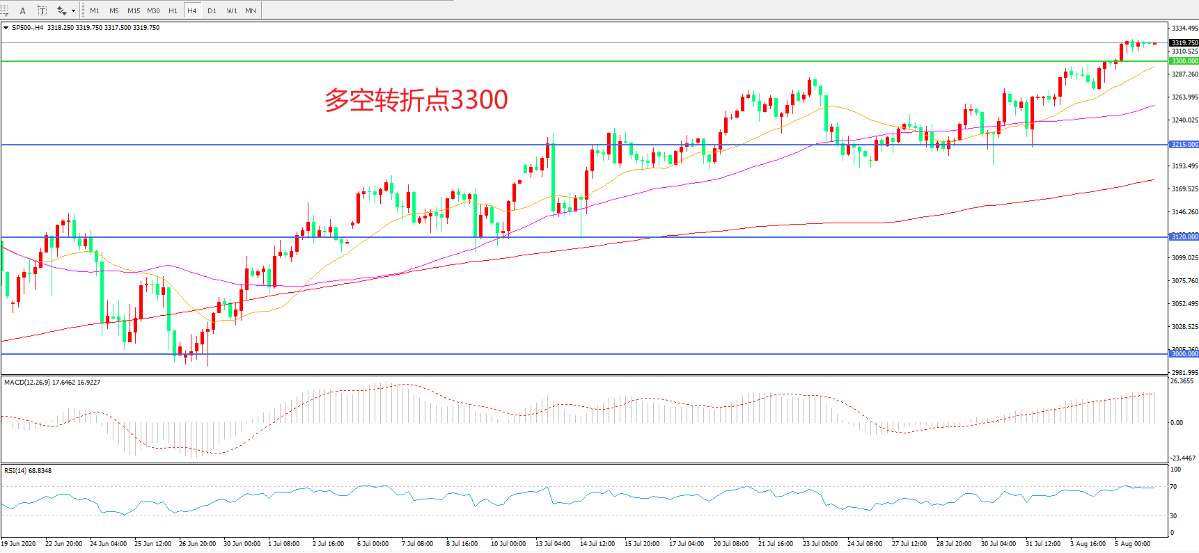 4小时图看,标普500延续高位震荡,整体表现偏强,均线系统呈多头排列, MACD红柱减少,RSI指标走平,日内延续上行概率较大。
