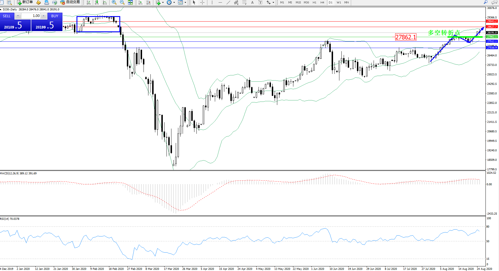 道琼斯指数8月25日(周二)收盘下跌60.00点,跌幅0.21%,报28248.44点。美股三大指数收盘涨跌不一,美国股市连续第三个交易日创下历史新高,随着经济从疫情冲击中逐步恢复,投资者预期美联储将保持宽松。道琼斯工业平均指数四天来首次下跌。美元指数下跌0.32%至93.00;低于7月初以来的阻力位21日移动均线;极低的利率和对更为鸽派的通胀政策的担忧降低了美元的相对吸引力,而相对较少的病例数也让人们与包括欧洲在内的其他地区相比,对美国经济复苏的速度产生了怀疑。美国8月消费者信心跌至逾六年低点,因家庭对就业市场和收入感到担忧,令外界对美国经济从新冠衰退中复苏的可持续性产生怀疑。本周关于美元的主要关注点是,看鲍威尔是否会暗示美联储将把通胀目标调整为一个平均值。这将允许通胀在美联储加息前升到比之前高的水平,这将对美元造成进一步的负面影响。