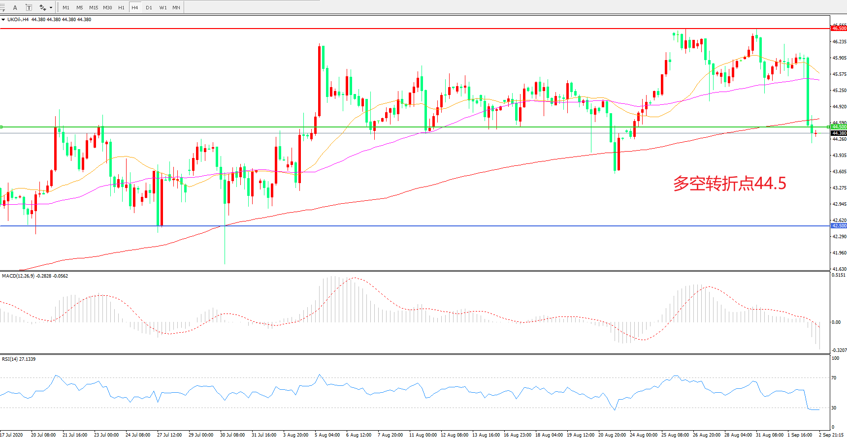 交易策略: 在44.50之下看跌,目标42.50 40.00