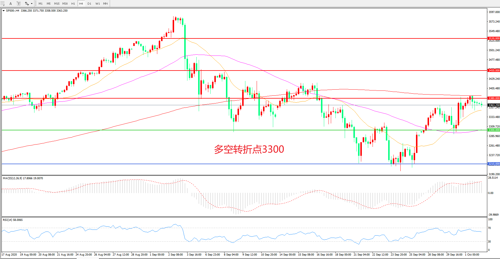 4小时图看,标普500冲高回落,短期涨势遇阻,但反弹形态依然完好,200均线成为上方阻力,21周期均线成为短期支撑,MACD红柱增加,RSI指标走平,日内延续震荡概率较大。