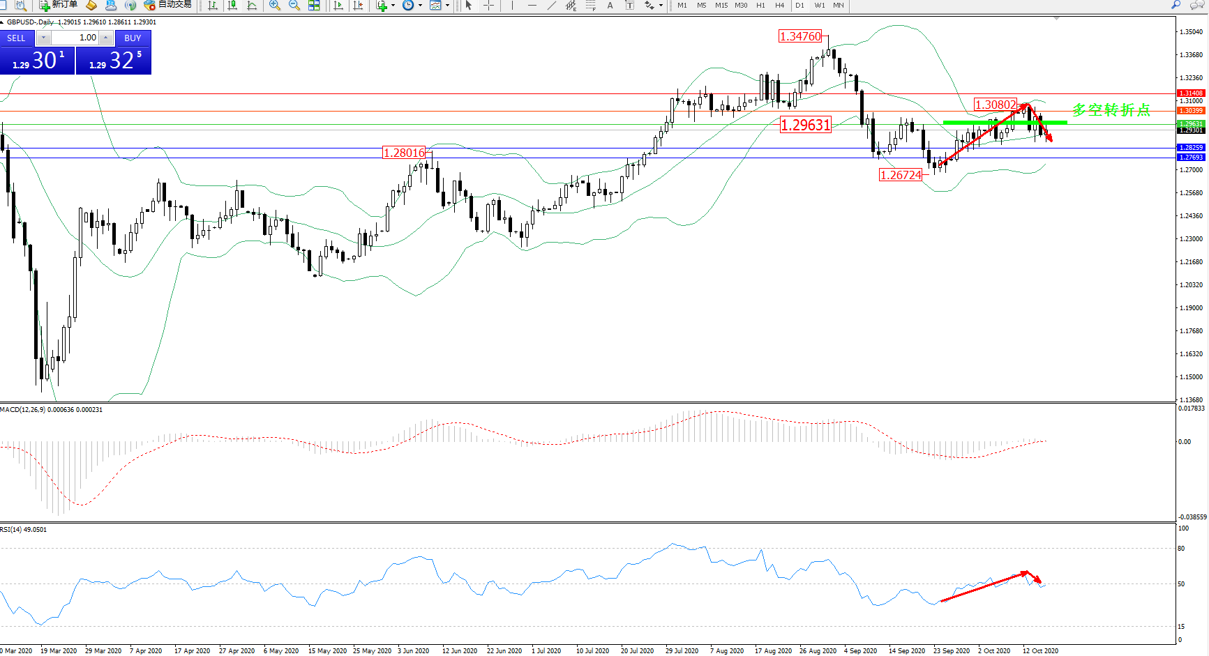 交易策略:1.29631下方看跌,目标1.30399、1.31408