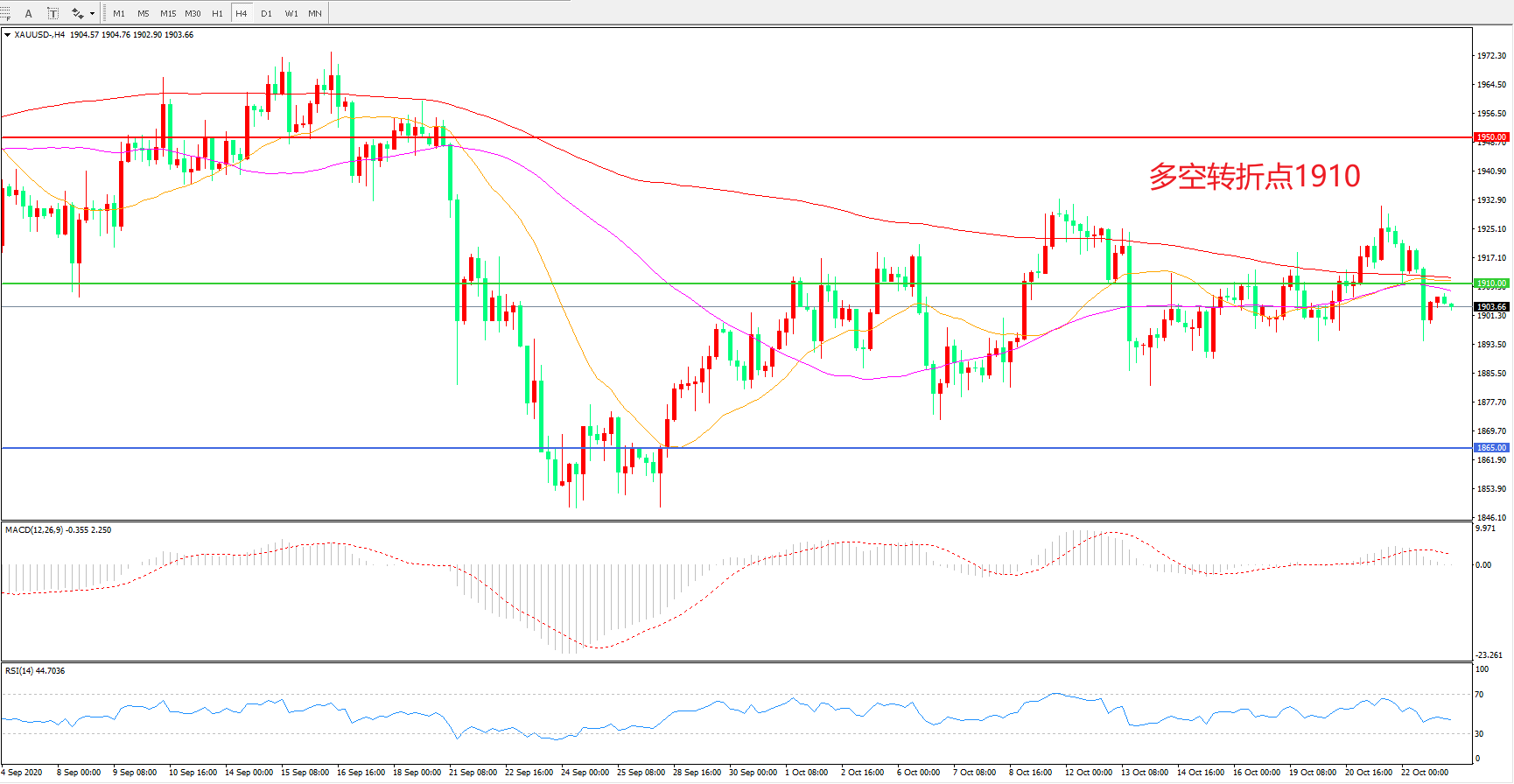周三(10月21日),因美国众议院议长佩洛西暗示,大选前两党无法就刺激方案达成妥协,美元指数走出七周低谷,现货黄金自高位跌逾30美元,险守1900关口,收报1904.64美元/盎司。目前看来,美国国会无法在大选前就新的刺激措施顺利达成任何协议,但超低利率环境下,金价将维持宽幅震荡形态,当通胀对冲需求进一步上升,金价才能实现进一步上涨。