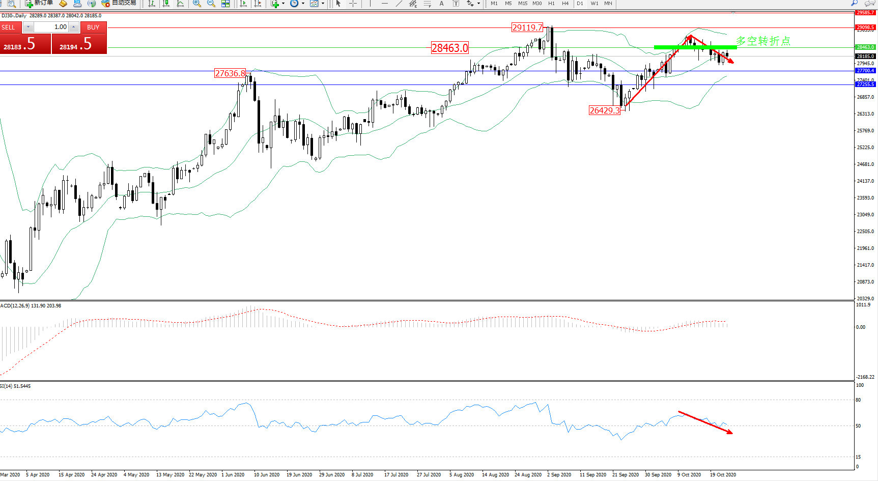 道琼斯指数10月23日(周五)收盘下跌28.10点,跌幅0.10%,报28335.57点。美股周五收盘涨跌不一,本周三大股指均录得跌幅。美国总统大选最后一场辩论落幕。投资者继续关注美国财政刺激僵局、财报及冠状病毒治疗方面的消息。因美国共和党与民主党就刺激方案迟迟不能达成共识;投资者继续关注美国财政刺激谈判进展、美元汇率以及即将到来的美国总统大选。美元指数下跌0.21%至92.74,盘中一度下跌0.3%;一周累跌1.03%;美国众议院议长佩洛希表示,仍有可能在11月3日大选之前达成新一轮的新冠肺炎援助协议,但是特朗普总统如果想要达成协议,就必须得到不情愿的共和党人的支持。市场已经消化了拜登获胜,仍预期将在今年年底前推出经济刺激方案。因此,风险偏好本周占据上风,因市场对大胆刺激措施的期望高涨,这令美元处于不利地位。